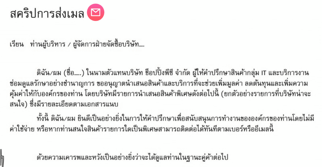 ดิฉัน/ผม (ชื่อ….) ในนามตัวแทนบริษัท ซ๊อปปิ้งพีซิ จำกัด ผู้ให้คำปรึกษาสินค้ากลุ่ม IT และบริการงานซ่อมดูแลรักษาอย่างชำนาญการ ขออนุญาตติดต่อแผนกจัดซื้อซึ่งเบื้องต้นดิฉัน/ผม ได้ทำการติดต่อไว้ทางอีเมลแล้วค่ะ